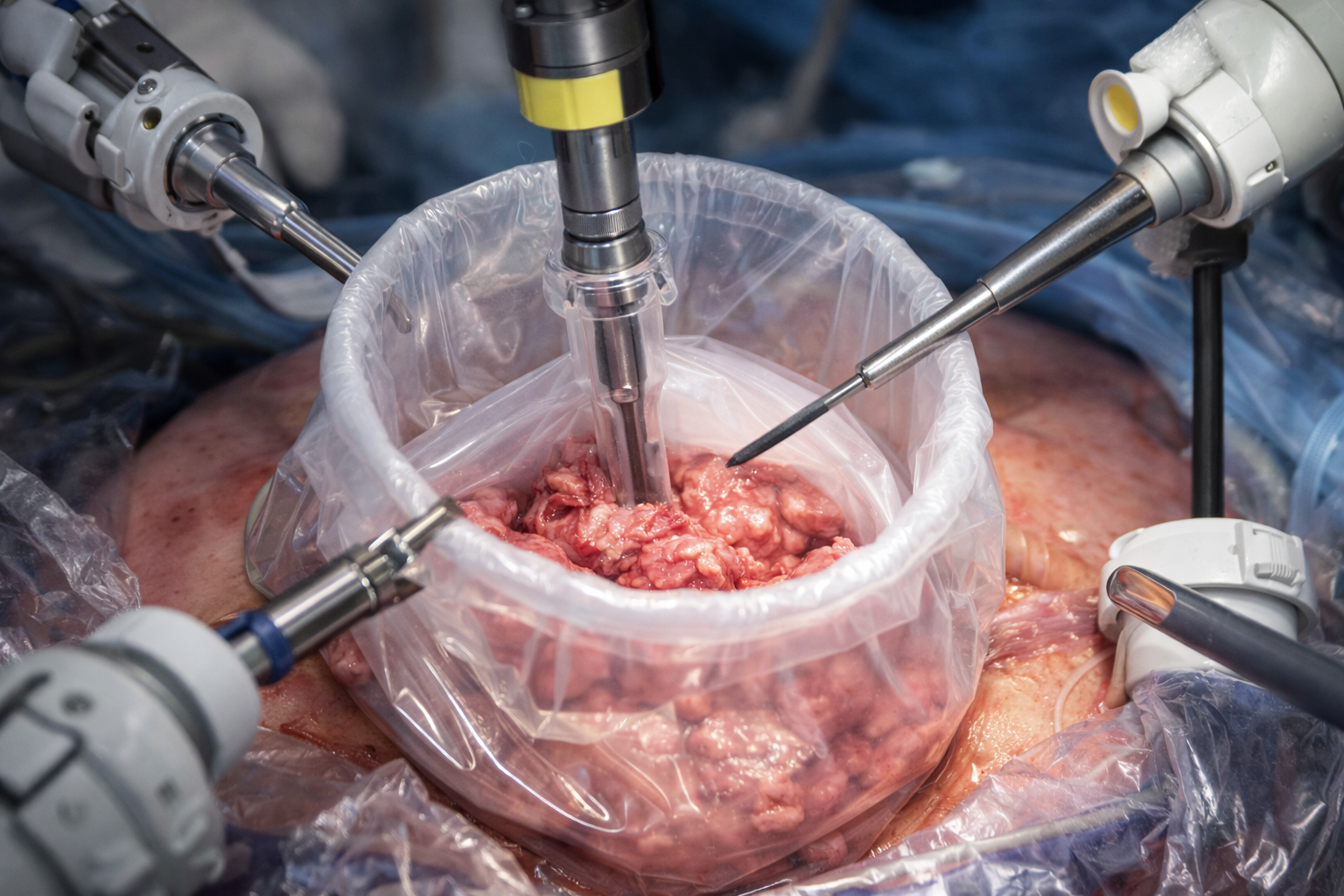 During this procedure, the uterus is removed through small incisions. A morcellation bag allows the uterus to be safely fragmented and removed without exposing surrounding organs to tissue fragments.